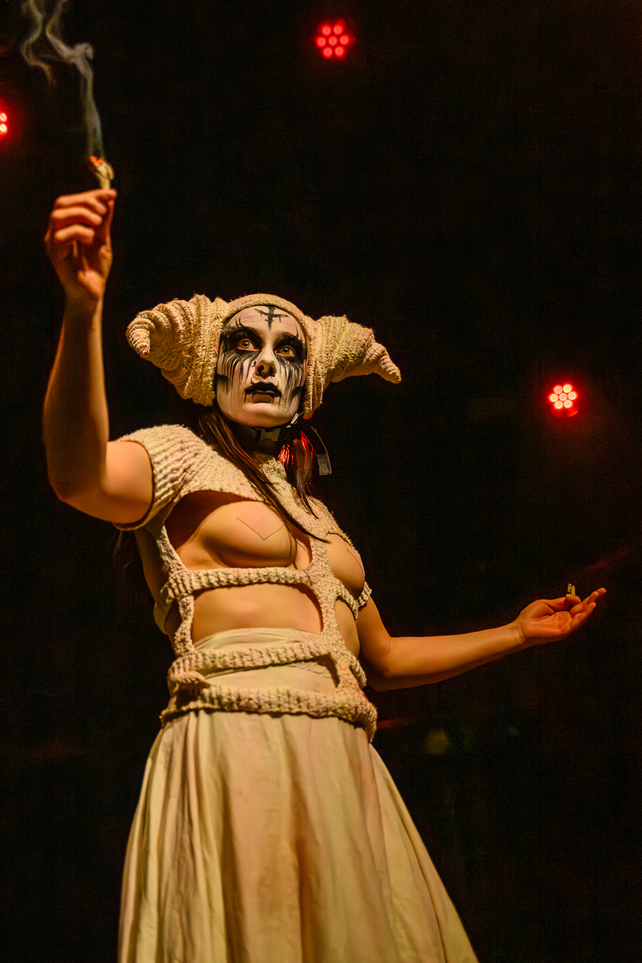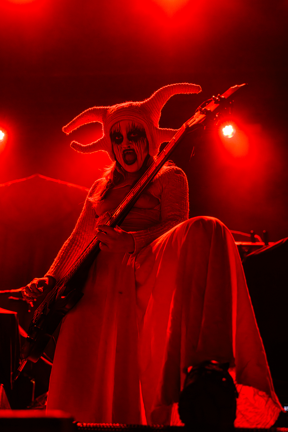 Gegen 19 Uhr eröffneten im ausverkauften Kölner E-Werk Witch Club Satan. Die norwegische Black-Metal-Formation besteht aus drei Damen, als sie Bühne betraten hüllten sie sich zunächst in dichten Weihrauch, begleitet von knurrenden dämonischen Klängen. Es war eher der Beginn eines Horrorfilms, als der eines Konzertes. Insgesamt sollte es wohl wie ein Hexen-Ritual wirken.