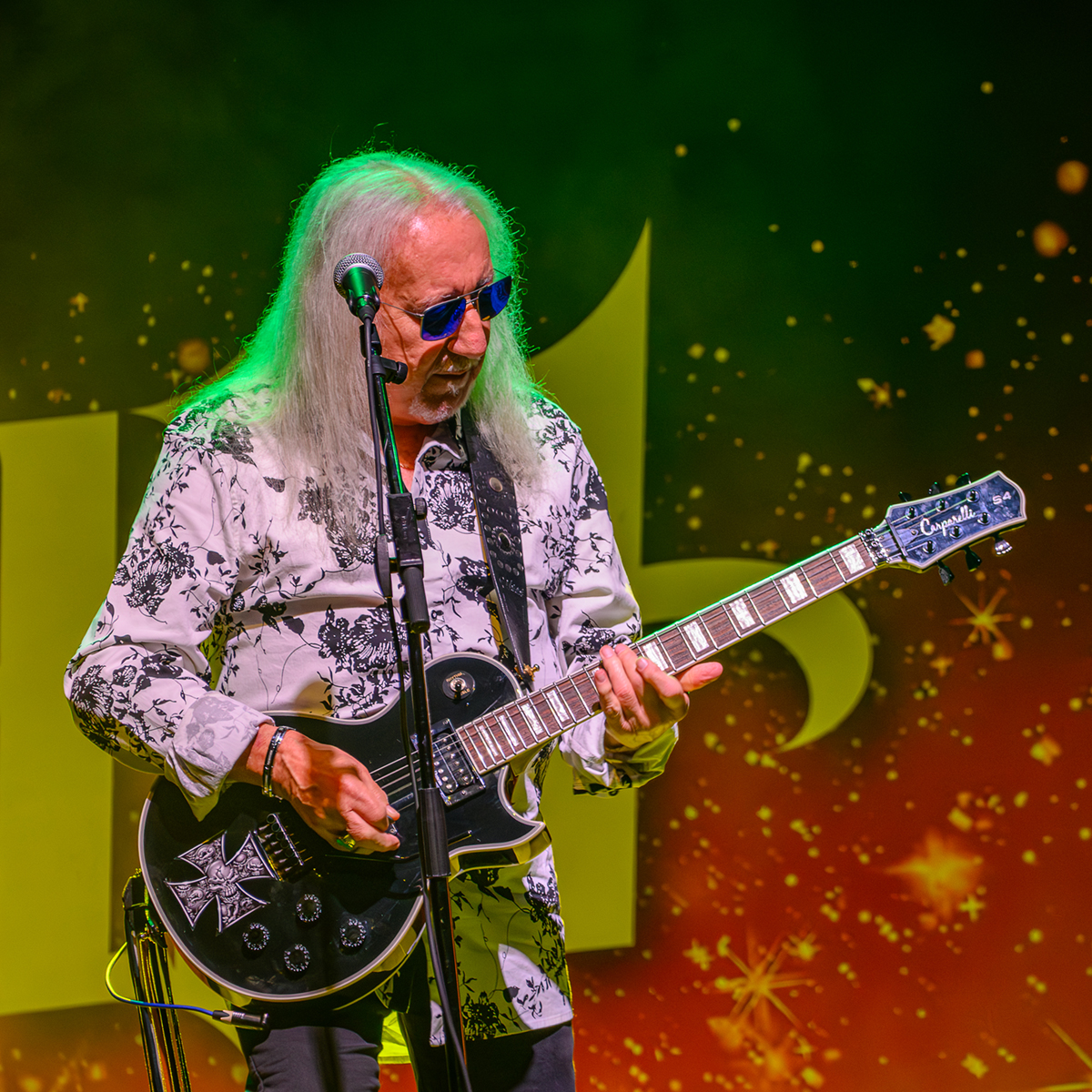 Gegen 21:00 Uhr war es soweit: Uriah Heep stürmten unter Jubel auf die Bühne. Im Zentrum stand Mick Box, das letzte Gründungsmitglied, dessen unerschütterliche Spielfreude und Humor das Publikum sofort in den Bann zogen. Trotz seiner 78 Jahre wirkte er frisch, konzentriert und charismatisch – der Inbegriff des britischen Rock-Geistes.