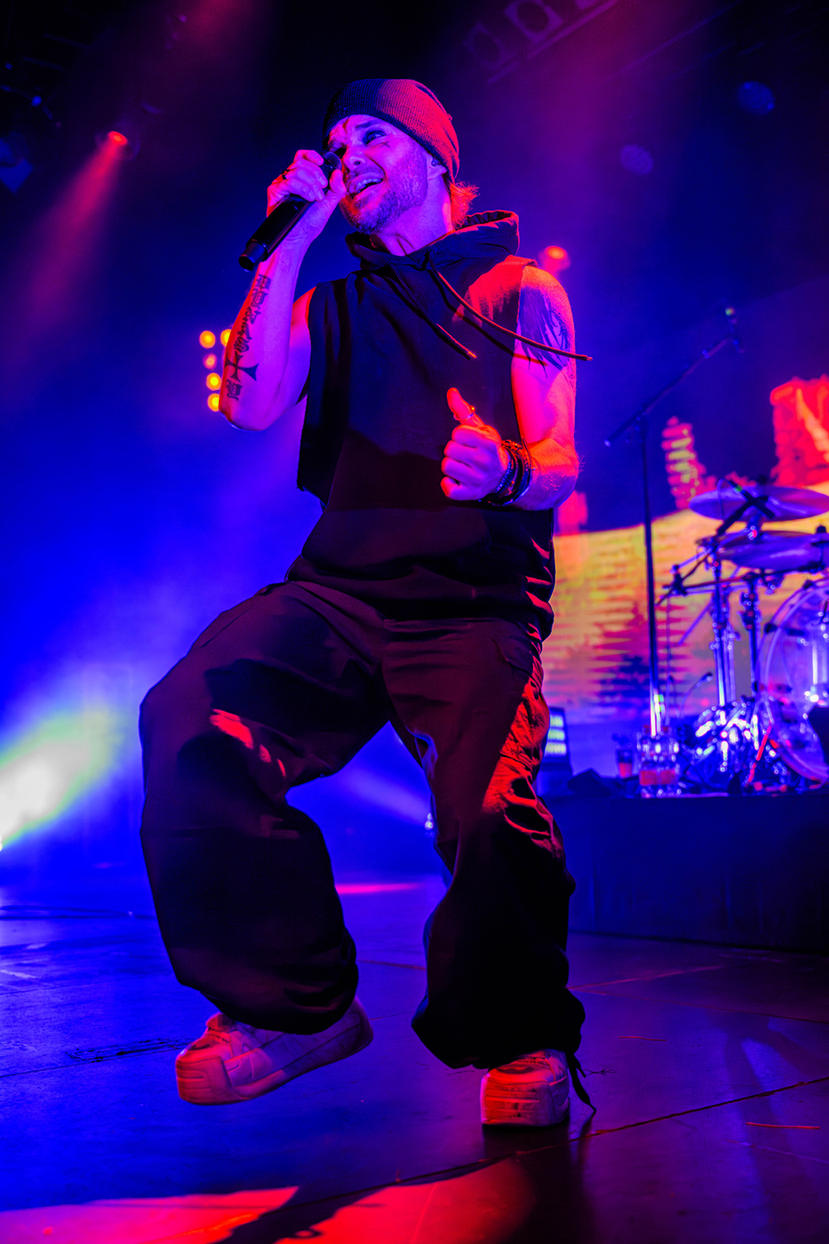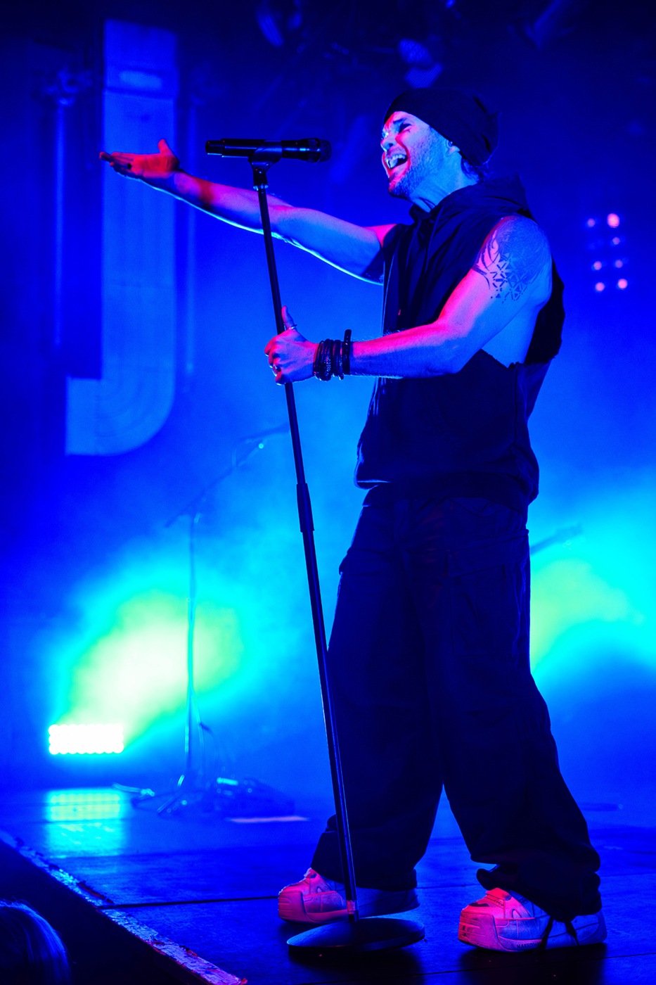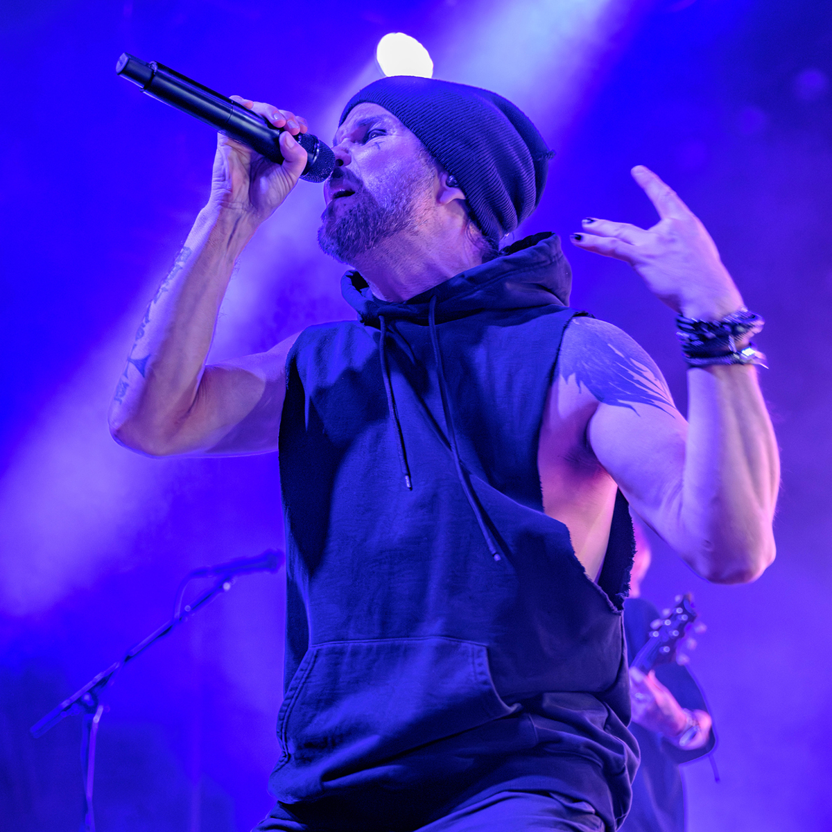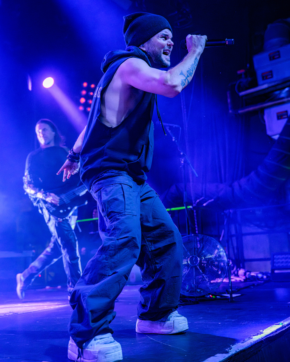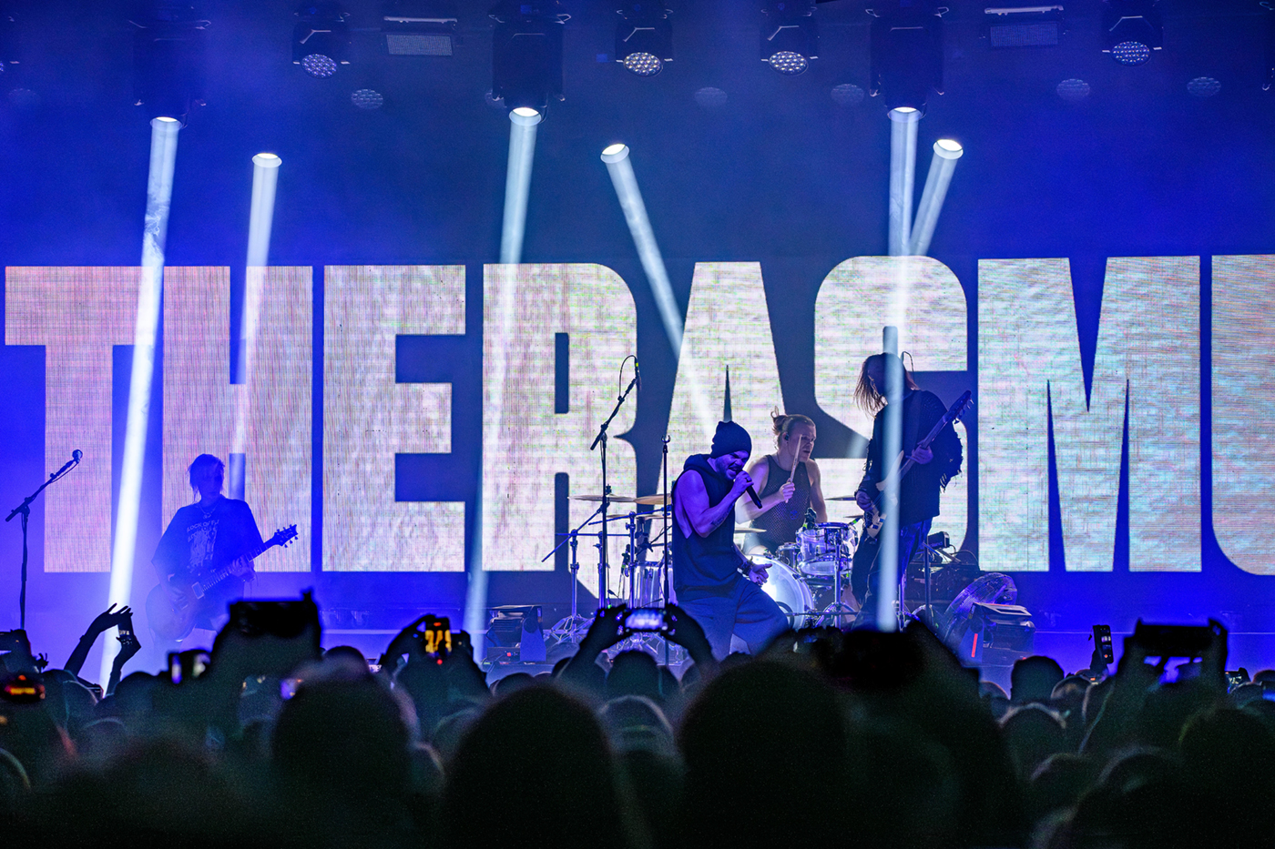 Nach einer etwas längeren Umbaupause ist Videoleinwand vom Vorhang befreit und die Erwartungen an The Rasmus hoch. In der Live Music Hall wird es kuschelig denn nun ist die Venue voll. 21:40 Uhr – The Rasmus eröffnen die Show mit der ersten Single ihres neuen Albums Weirdo, Rest in Pieces. Es ist alles beim Alten, Sänger Lauri Ylönen ballert wie ein Flummi über die Bühne und Bassist Eero Heinonen begrüßt das Publikum nach dem ersten Song in fast perfektem Deutsch. Dann haut die Band auch schon den zweiten Klassiker Guilty raus. Das Feuerwerk geht gleich unvermindert weiter mit No Fear. Was für ein Start in die Show.