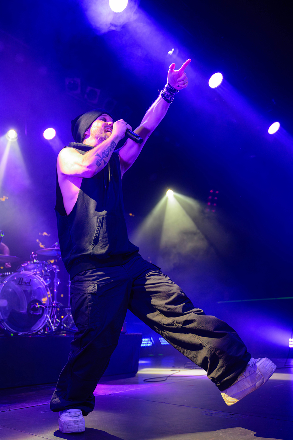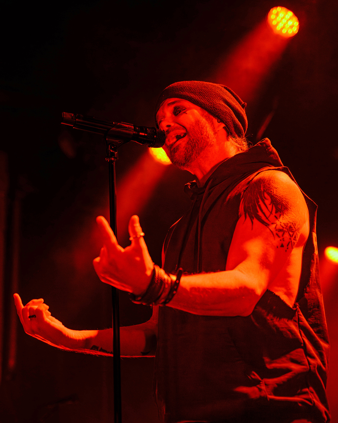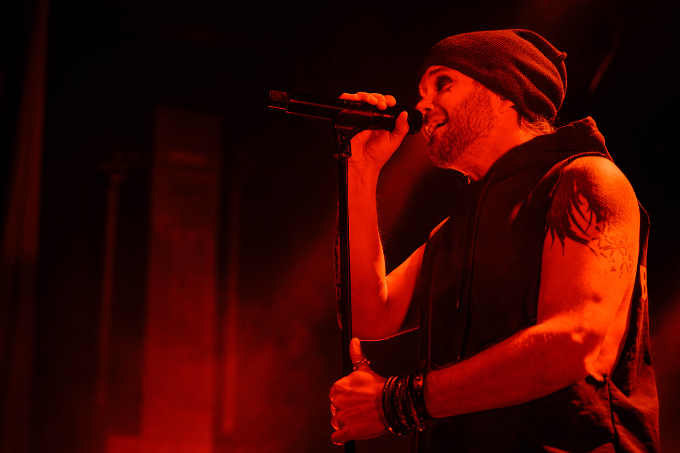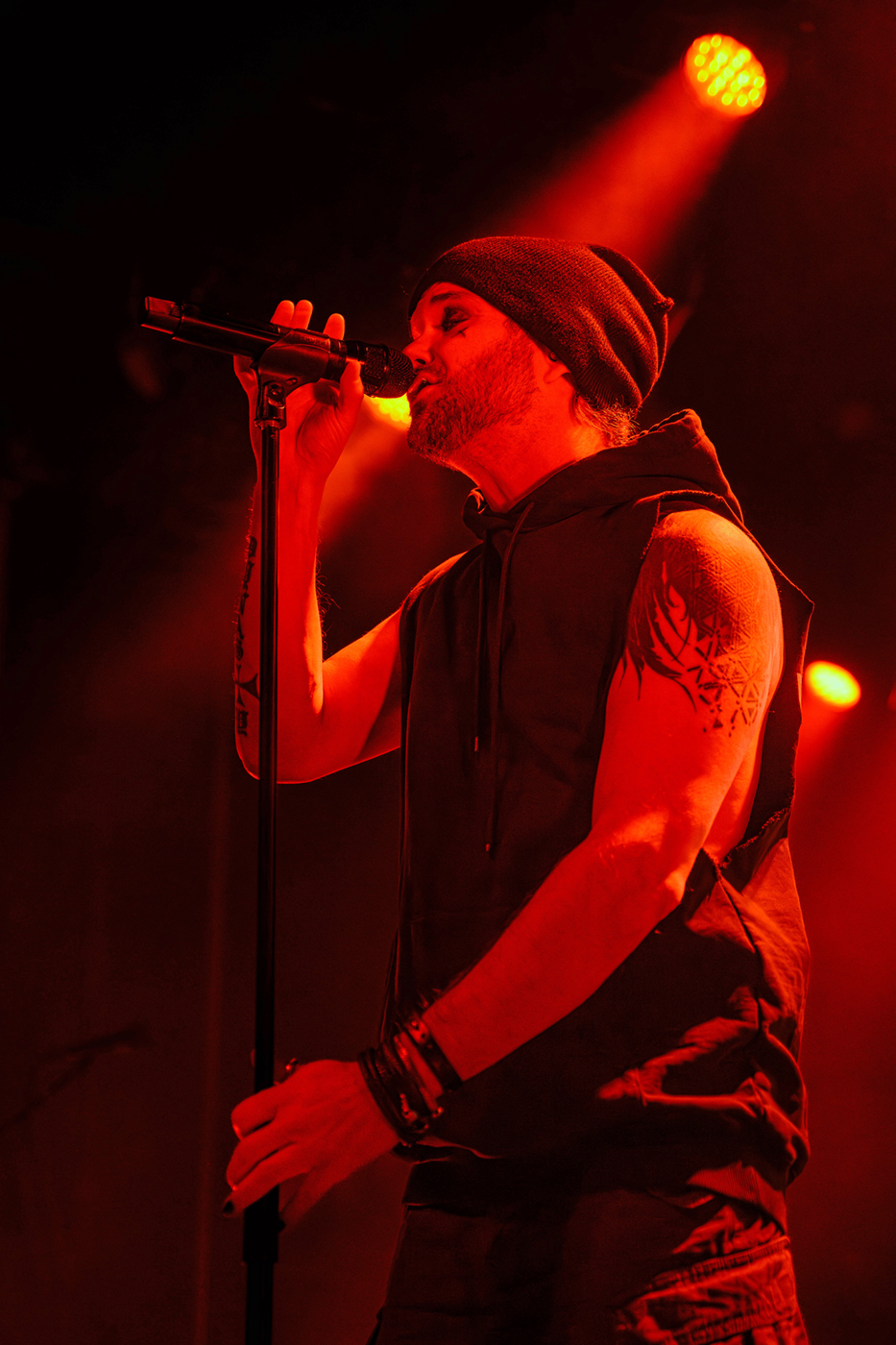 Nach einer etwas längeren Umbaupause ist Videoleinwand vom Vorhang befreit und die Erwartungen an The Rasmus hoch. In der Live Music Hall wird es kuschelig denn nun ist die Venue voll. 21:40 Uhr – The Rasmus eröffnen die Show mit der ersten Single ihres neuen Albums Weirdo, Rest in Pieces. Es ist alles beim Alten, Sänger Lauri Ylönen ballert wie ein Flummi über die Bühne und Bassist Eero Heinonen begrüßt das Publikum nach dem ersten Song in fast perfektem Deutsch. Dann haut die Band auch schon den zweiten Klassiker Guilty raus. Das Feuerwerk geht gleich unvermindert weiter mit No Fear. Was für ein Start in die Show.