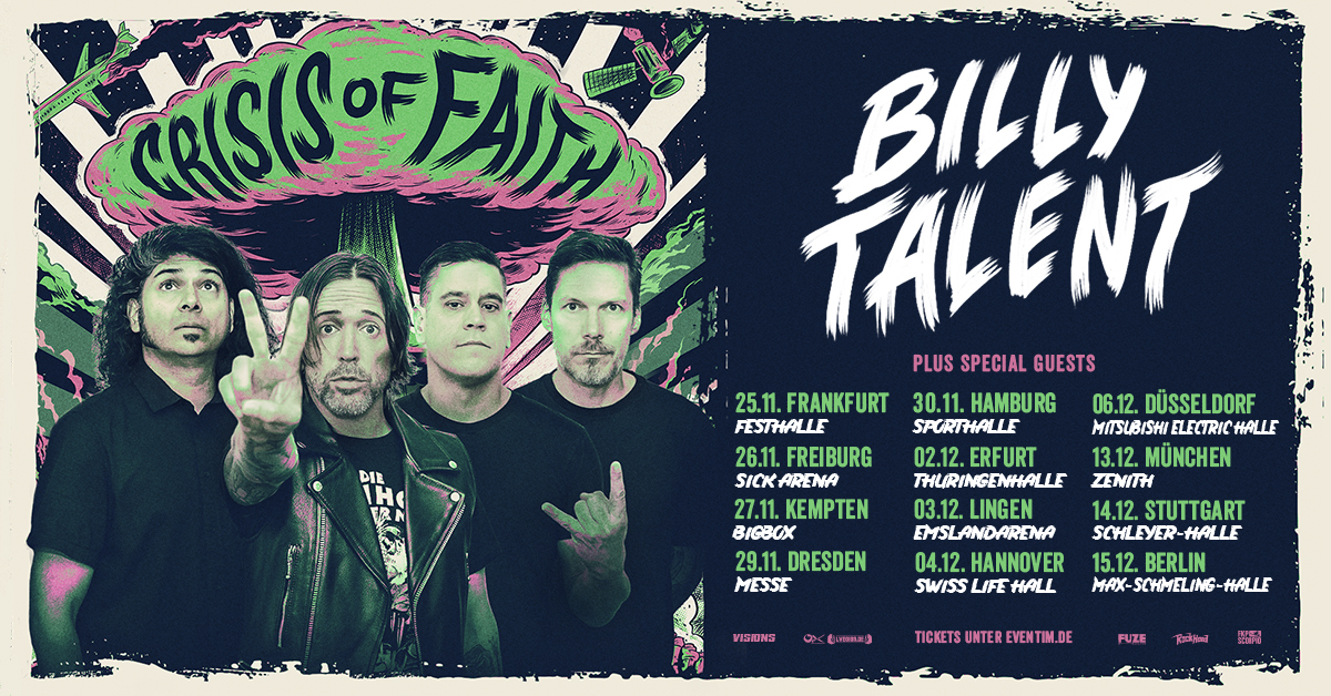 Sechs lange Jahre mussten die Fans von Kanadas erfolgreichstem Punk- und Alternative-Rock-Export auf neues Material warten. Doch seit Veröffentlichung des sechsten Billy Talent Albums „Crisis of Faith“ Anfang des Jahres überschlagen sich die Ereignisse: Die Platte kletterte u.a. in Deutschland und Kanada sofort an die Spitze der Charts; die drei Singles „Reckless Paradise“, „I Beg to Differ (This Will Get Better)“ und „End of Me” stiegen allesamt ebenfalls bis auf Platz 1 der deutschen und kanadischen Airplay-Charts und wurden bereits vor Erscheinen des Albums über 50 Millionen Mal gestreamt. Nun wurden auch weltweite Konzertdaten angekündigt, darunter ein komplettes Dutzend Shows in Deutschland zwischen Mitte November und Mitte Dezember 2022.