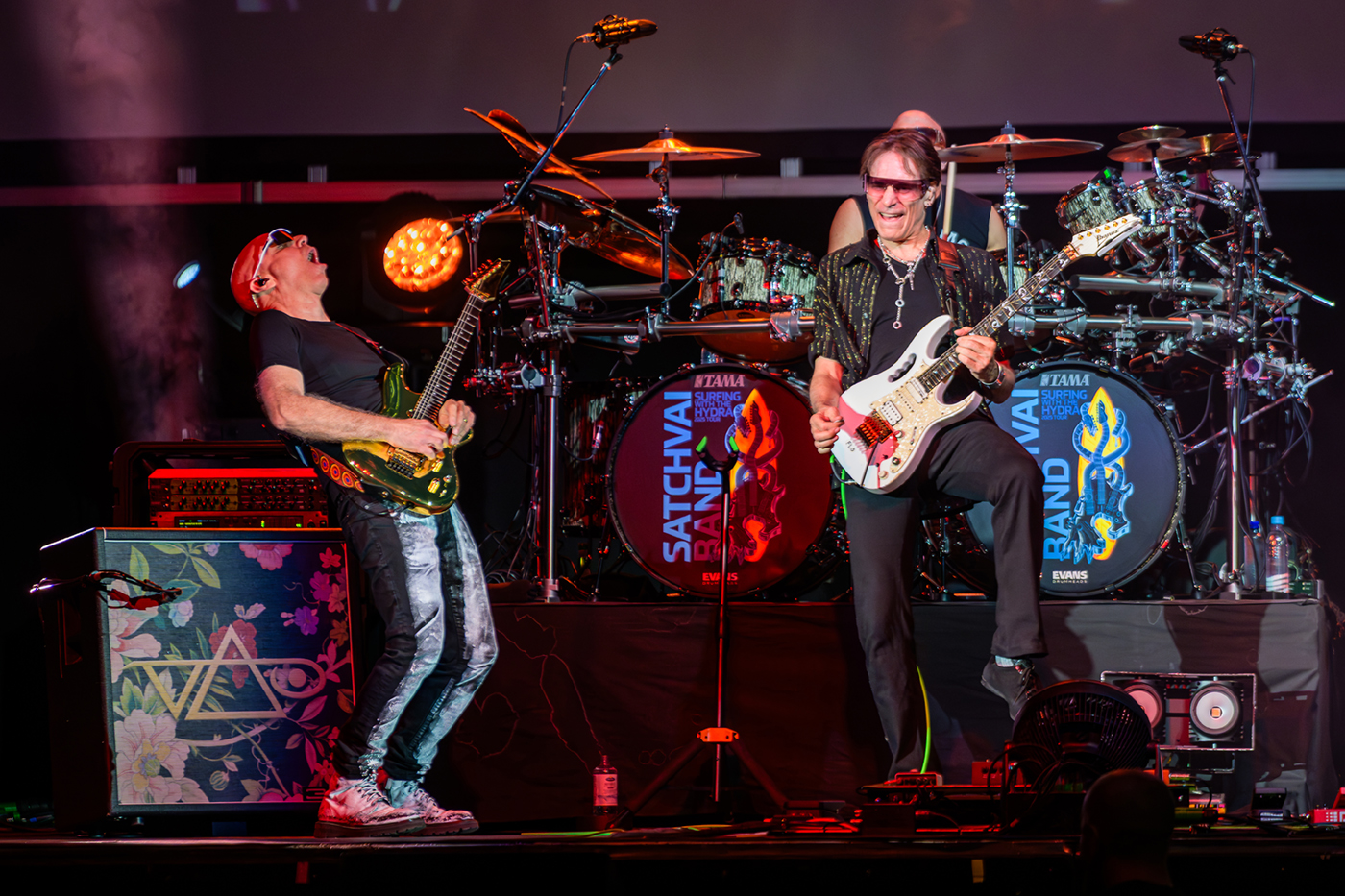 Der Hauptact beginnt: Zwei Musiker, zwei Legenden die sich seit fast 50 Jahren schätzen – Joe Satriani und Steve Vai – auf ihrer (hoffentlich nicht einmaligen) „Surfing with the Hydra“-Tour. Wie nicht anders zu erwarten, ist auch die Band, die sie begleitet, nicht von schlechten Eltern: Marco Mendoza „Vocals“ und am Bass, Kenny Aronoff am Schlagzeug und Pete Thorn an der Rhythmusgitarre.